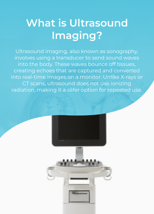 Ultrasound imaging, also known as sonography, involves using a transducer to send sound waves into the body. These waves bounce off tissues, creating echoes that are captured and converted into real-time images on a monitor. Unlike X-rays or CT scans, ultrasound does not use ionizing radiation, making it a safer option for repeated use.