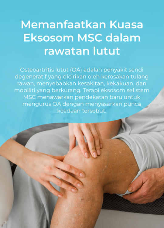 Osteoartritis lutut (OA) adalah penyakit sendi degeneratif yang dicirikan oleh kerosakan tulang rawan, menyebabkan kesakitan, kekakuan, dan mobiliti yang berkurang. Terapi eksosom sel stem MSC menawarkan pendekatan baru untuk mengurus OA dengan menyasarkan punca keadaan tersebut.
